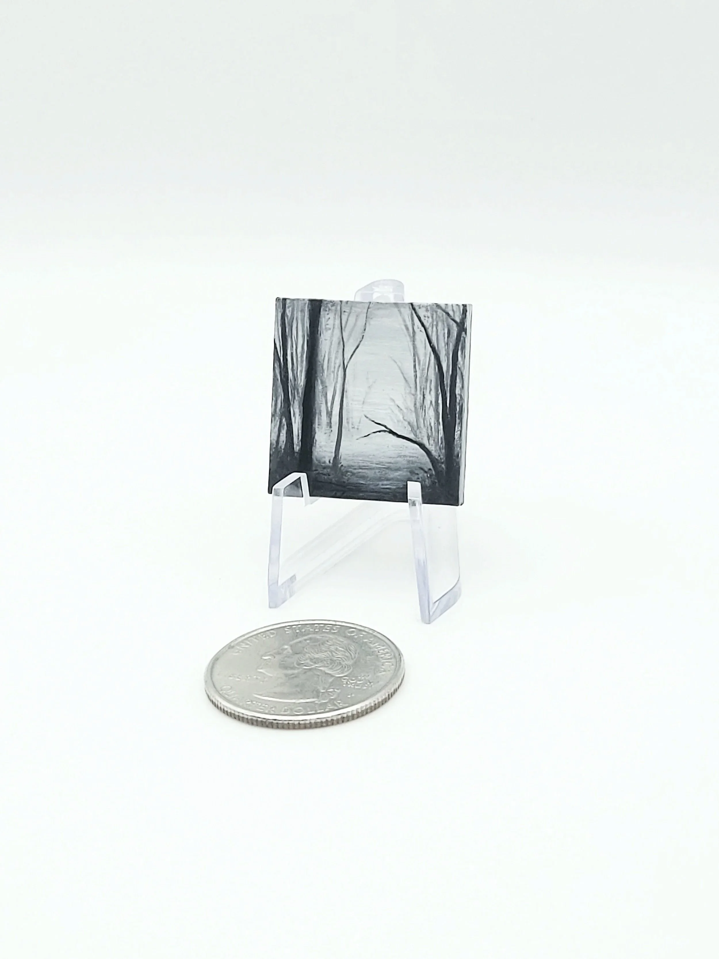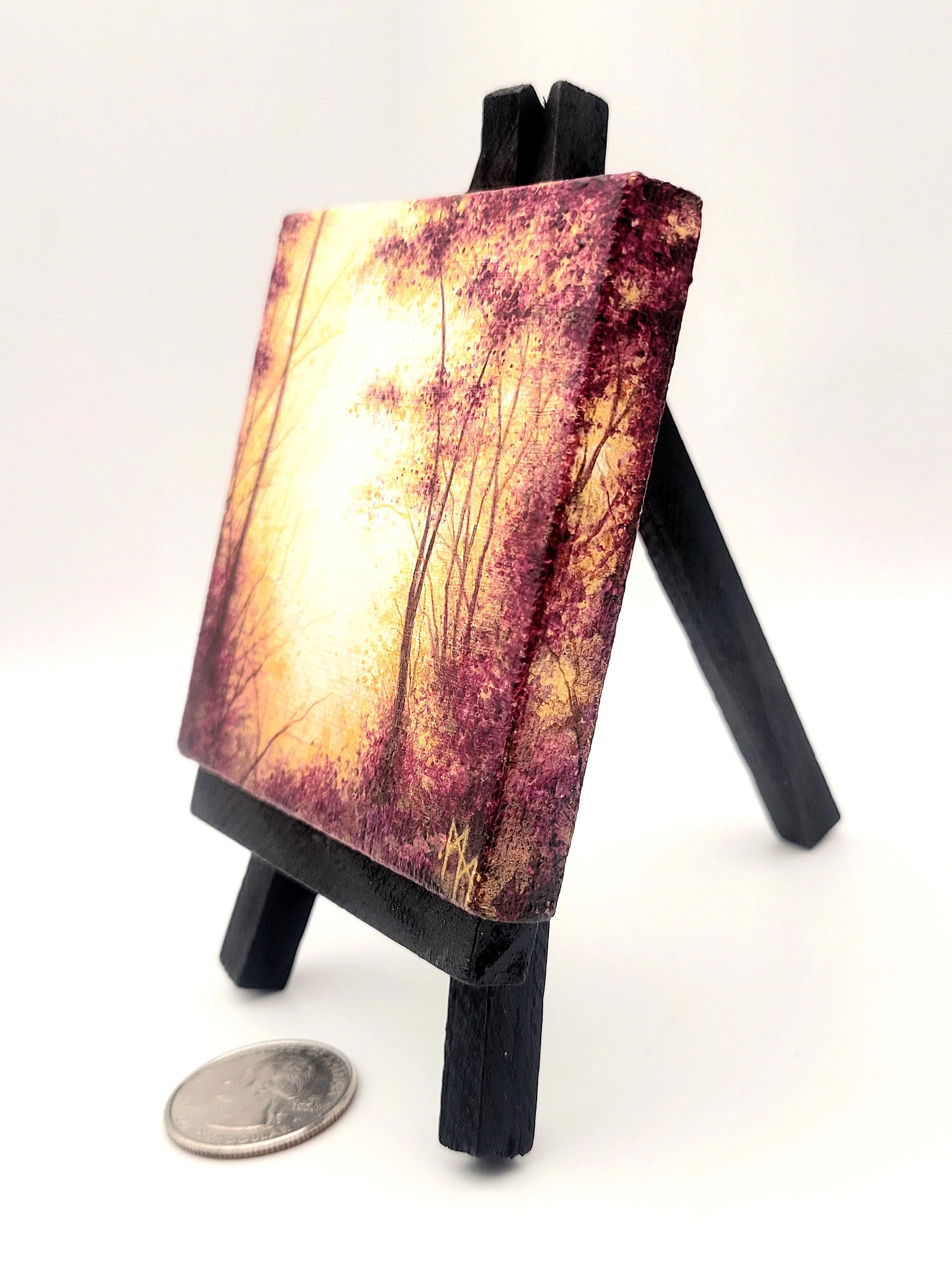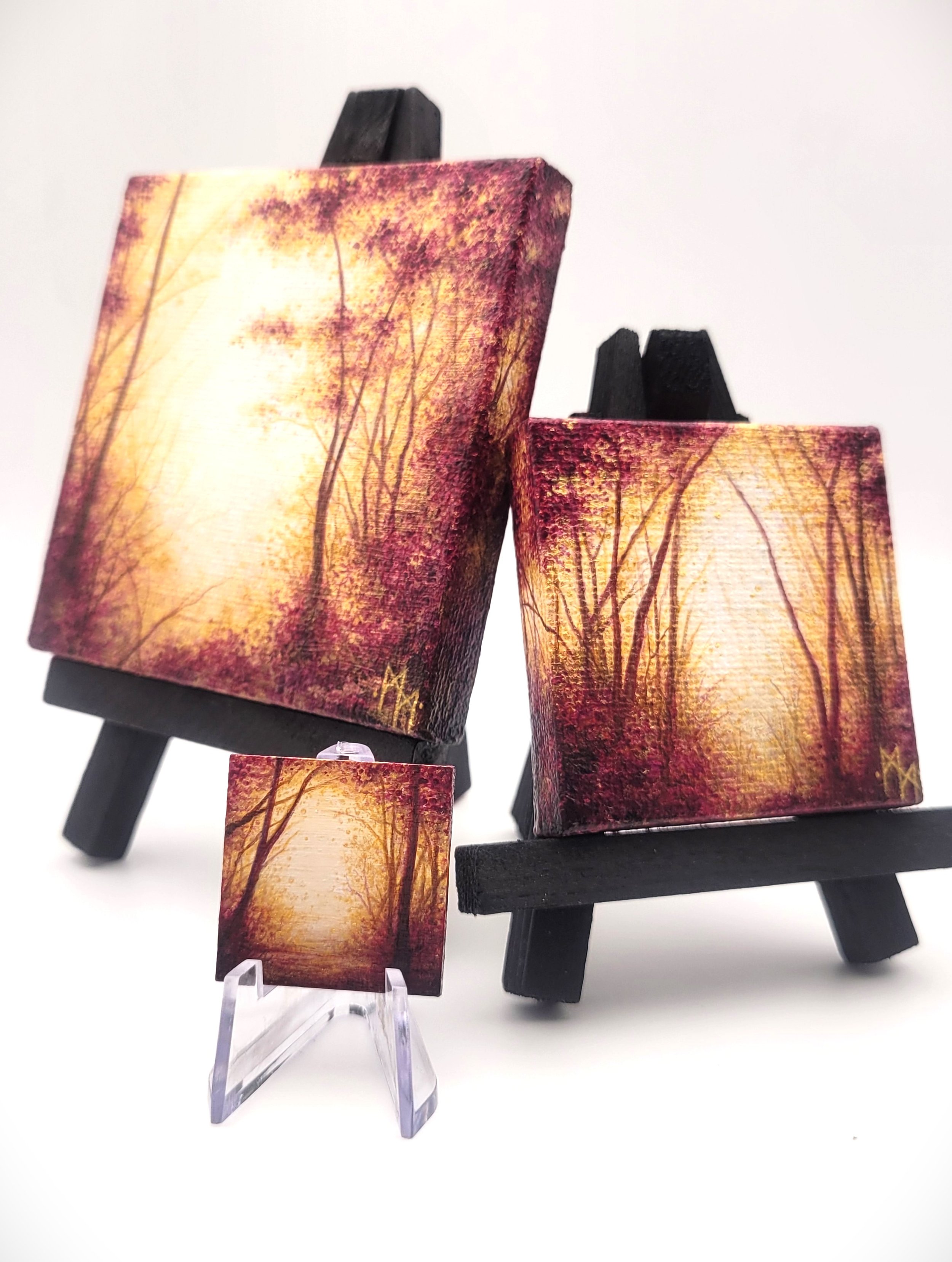 This is the first style of paintings to break away from my signature grayscale forests. These include not just color, but the actual shine from metallic acrylic paints into a new set of worlds. Creating these felt like wielding light itself with a paintbrush -and it molds an entirely new atmosphere of warmth and home of its own. These gilded forests are the absolute definition of comfort as the richness of their color come to life at your fingertips. Here you can find a growing array of pocket-sized and professionally painted canvases waiting for exactly the right home.