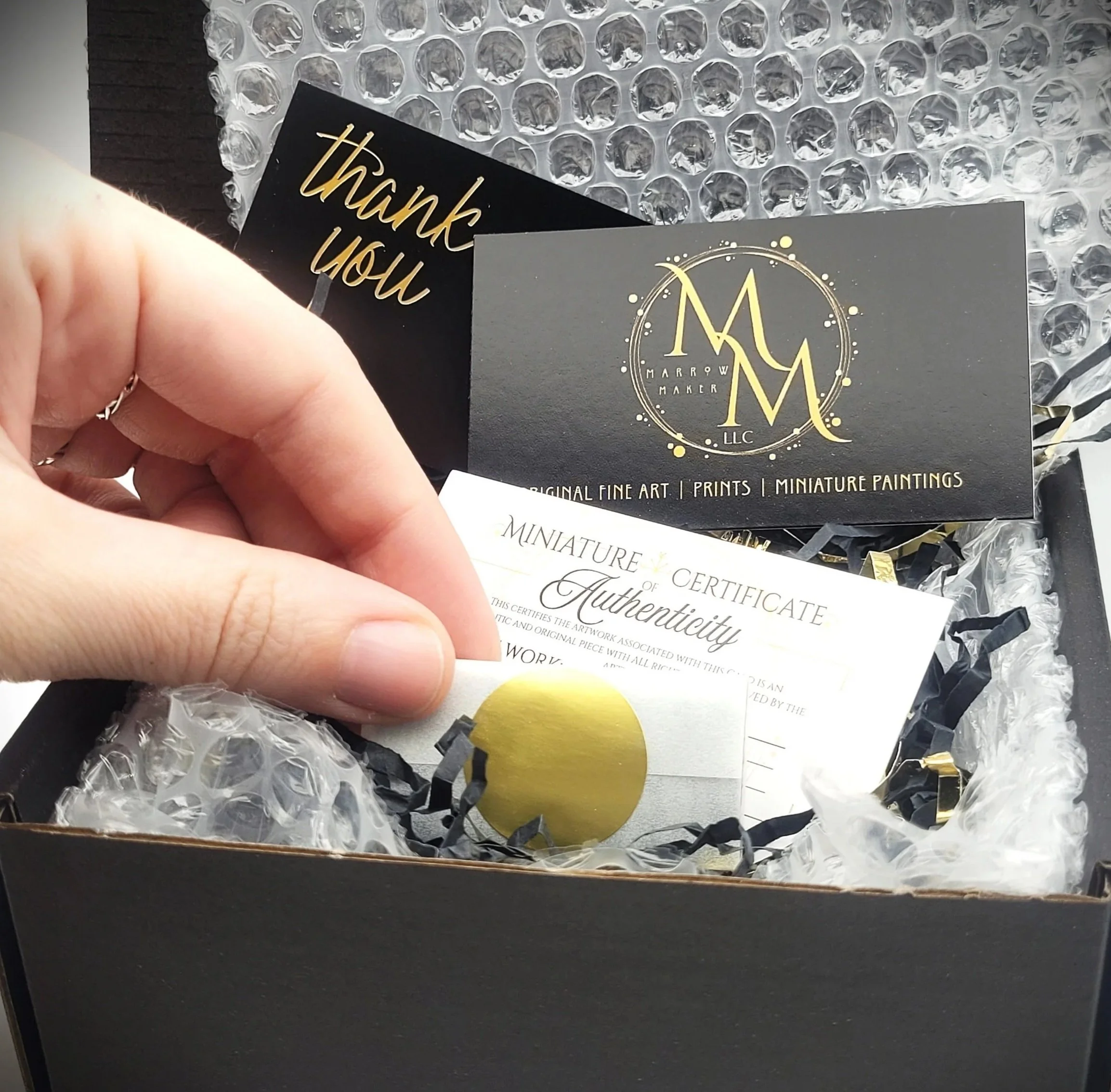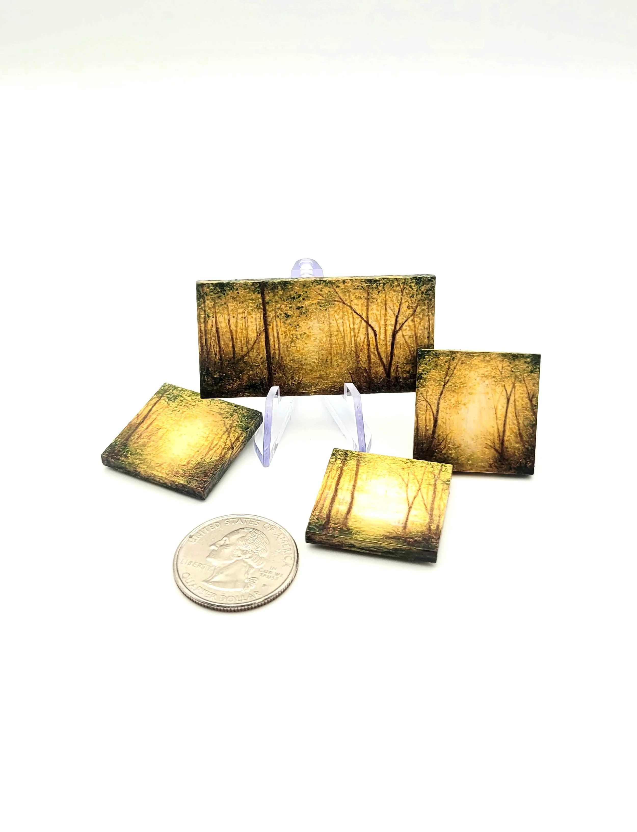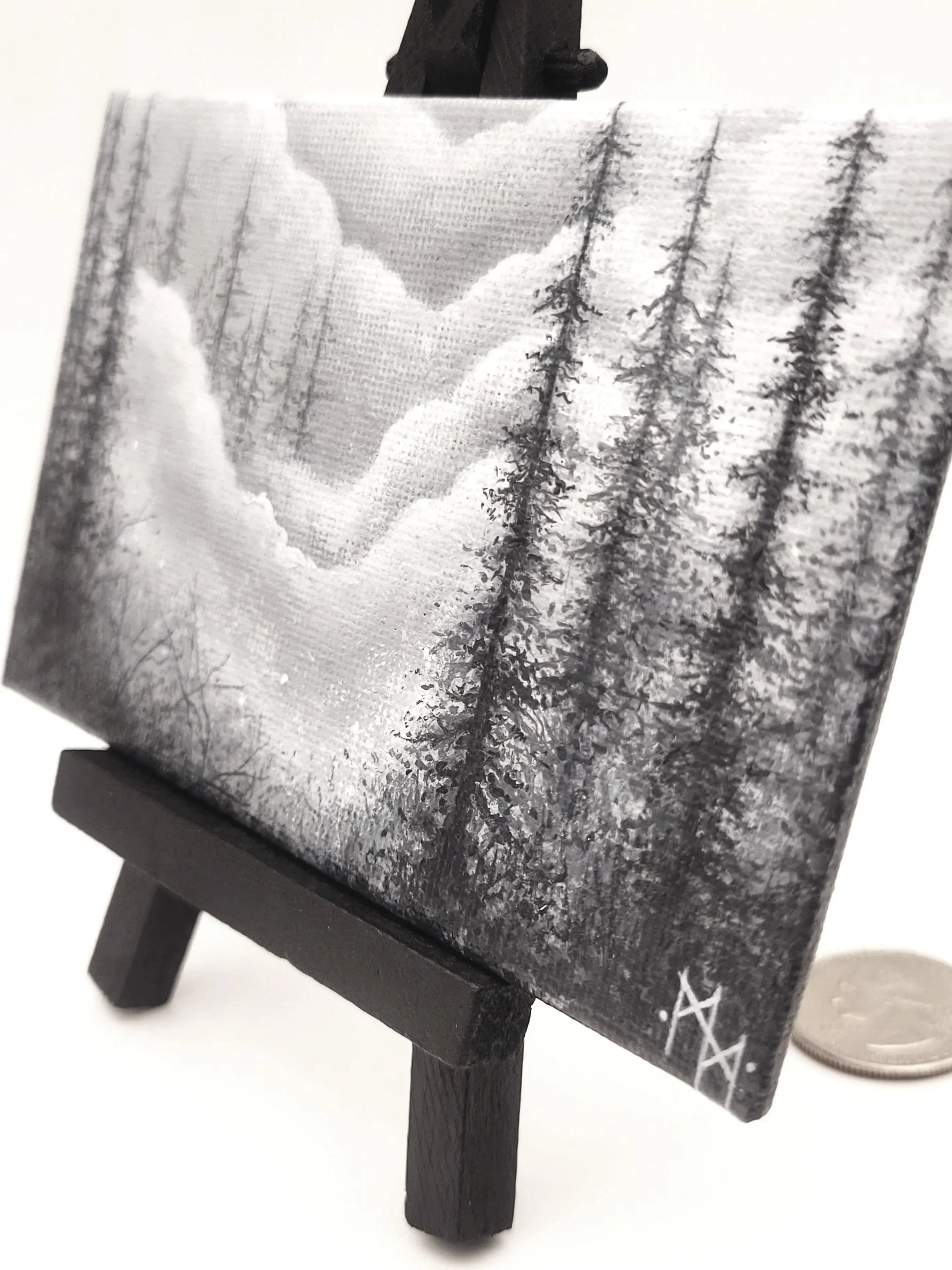 This is the first style of paintings to break away from my signature grayscale forests. These include not just color, but the actual shine from metallic acrylic paints into a new set of worlds. Creating these felt like wielding light itself with a paintbrush -and it molds an entirely new atmosphere of warmth and home of its own. These gilded forests are the absolute definition of comfort as the richness of their color come to life at your fingertips. Here you can find a growing array of pocket-sized and professionally painted canvases waiting for exactly the right home.